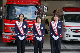 | 11月13日(木)秋の火災予防運動の一環として、管内3事業所(社会医療法人大西会千曲中央病院様、医療法人長野寿光会上山田病院様、坂城保育園様)より、1名ずつ職員を派遣していただき、「一日消防士」を任命しました。 3名には消防業務を体験していただいたほか、管内の商業施設や保育園などを訪れ、地域の皆様に広く火災予防と住宅用火災警報器の設置等について呼びかけていただきました。ご協力ありがとうございました。 |