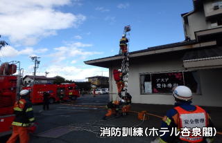 また、消防・救助訓練については、稲荷山温泉 ホテル杏泉閣と当本部による合同訓練を実施し、防火意識の高揚を図りました。 |