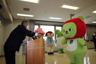 | 千曲坂城消防本部では、秋季火災予防運動に伴う「一日消防長・消防署長」事業を実施しました。 一日消防長には、長野県のキャラクターである「アルクマ」が務め、一日消防署長には、各署の地 域で活躍する「あん姫」(千曲市)、「ねずこん」(坂城町)、「ヤシロウ」(千曲商工会議所)が 務めました。一日消防長と消防署長は管内幼稚園・保育園や商業施設などを訪れ、地域の皆様に広く 火災予防と住宅用火災警報器の設置等について呼びかけました。 |